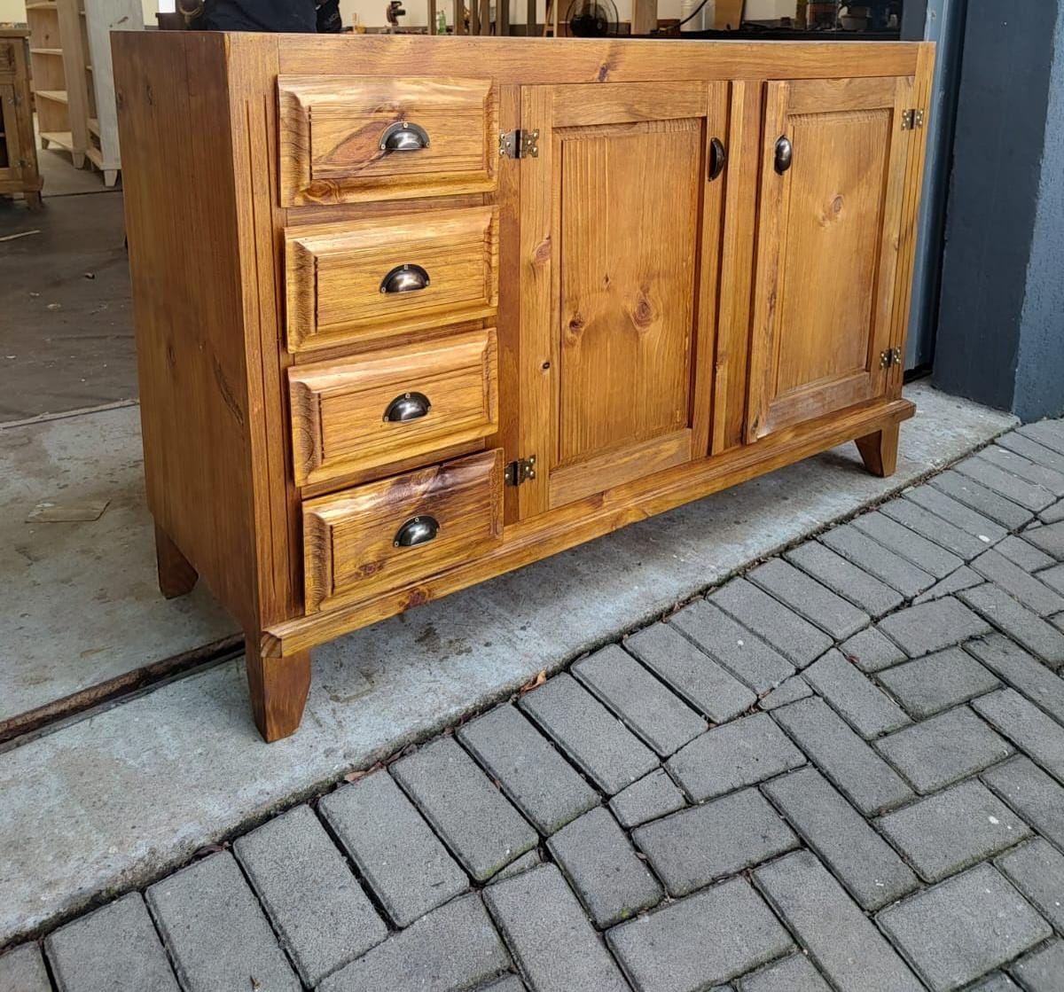 Descrição: Balcão de pia com 2 portas e 3 gavetas, prateleira interna de madeira e corrediças de madeira.