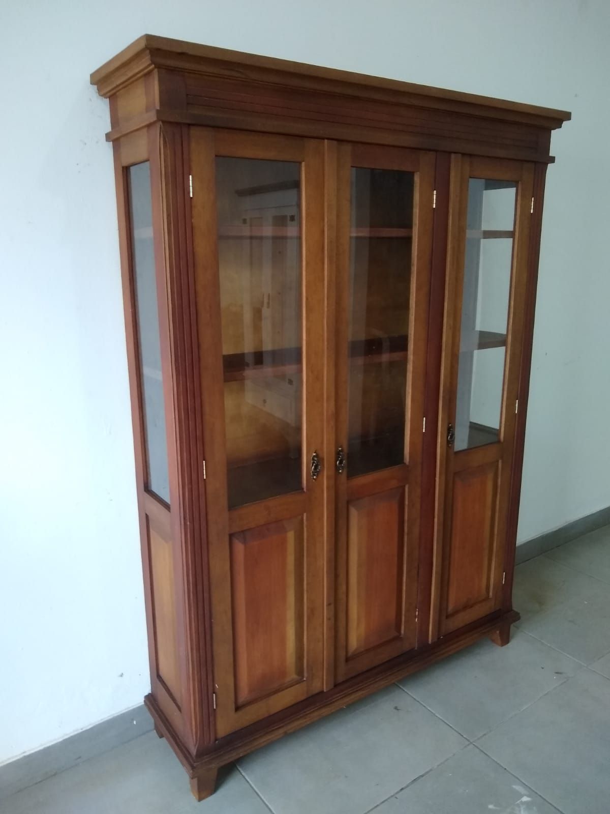 Descrição: 3 Portas, com parte superior fechada, Lateral Vidro, Prateleiras madeira, Sem Gaveta